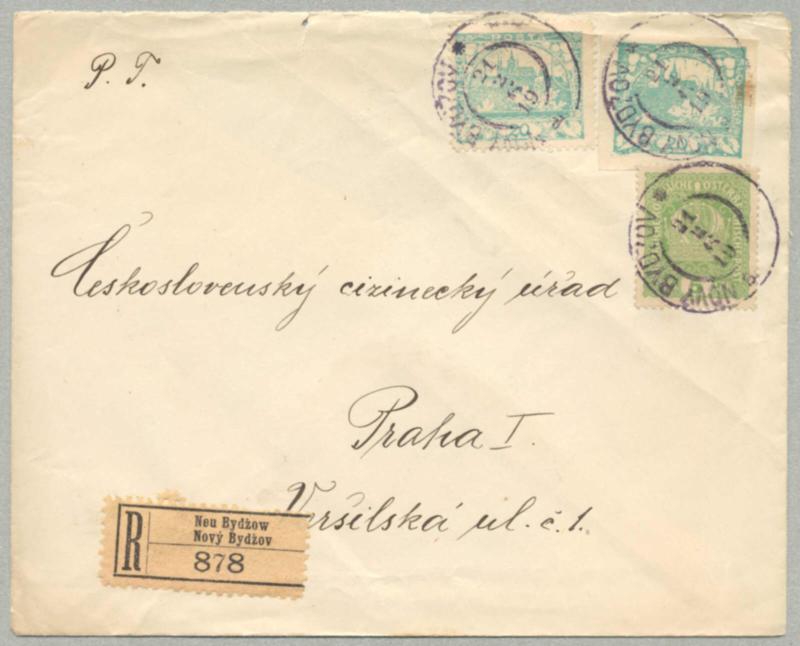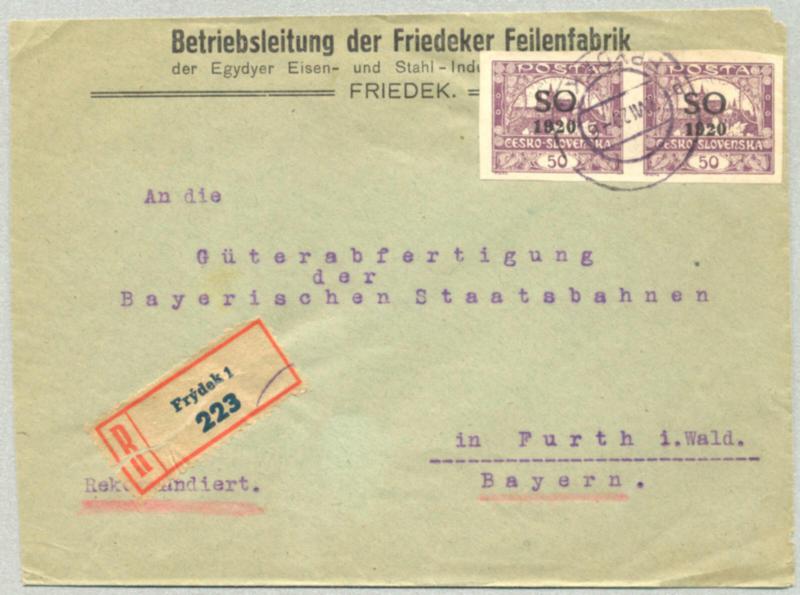 1920, interesting franking with SO/1920 opt on Hradcany, FRYDEK, on folded registered envelope, very fresh and attractive, XF! Estimate 600€.