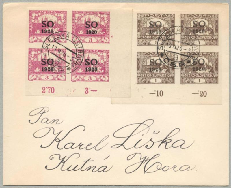 1920, interesting franking with SO/1920 opt on Hradcany, blocks of four with imprinted calculus numbers, on envelope, very fresh and attractive, XF! Estimate 600€.