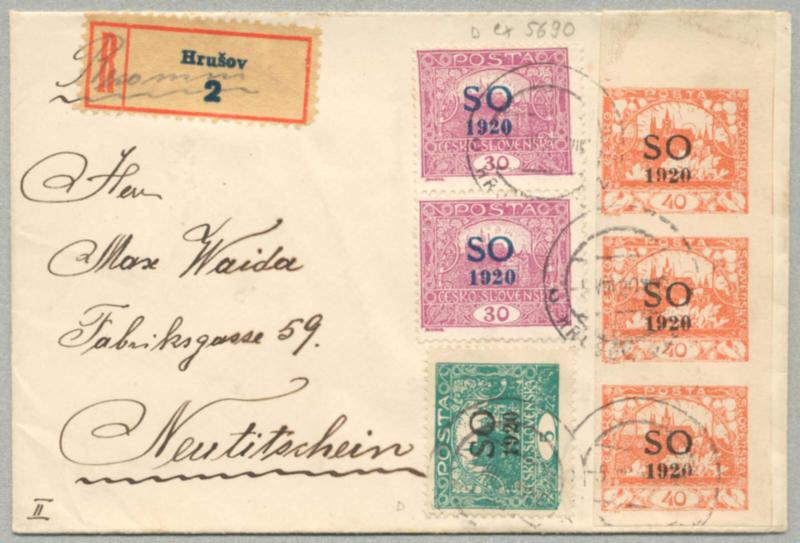 1920, interesting franking with SO/1920 opt on Hradcany, HRUSOV, on folded registered envelope to Neutitschein, very fresh and attractive, XF! Estimate 600€.