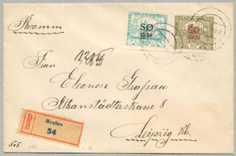 1920, interesting franking with SO/1920 opt on Hradcany, HRUSOV, on folded registered envelope to Leipzig/Germany, very fresh and attractive, XF! Estimate 600€.