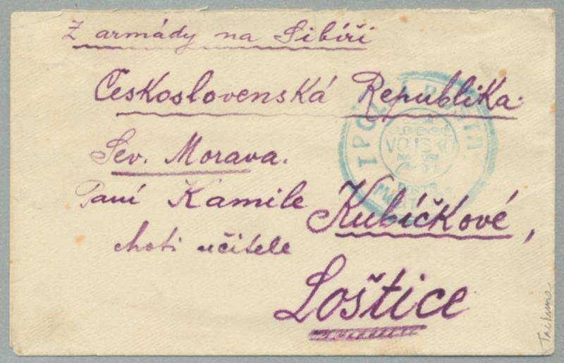 1919, from military unit in Siberia to Lostice, addressed to civilian addressee in northern Moravia, unfranked soldiers letter with large circular military postmark featuring bilingual Czech French inscription and a numeral, partially illegible, likely belonging to the numbered series 1 to 15 used f