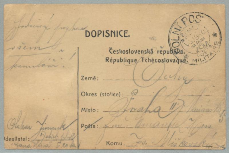 1919, from Irkutsk to Praha, bilingual military postcard from the Czechoslovak Legion in Siberia, sent via POLNI POST VOJSKO NA RUSI POSTE MILITAIRE circular cancel, small bilingual type introduced after October 1919 from Legion headquarters at Irkutsk, however message is clearly dated 5 IX 1919, in