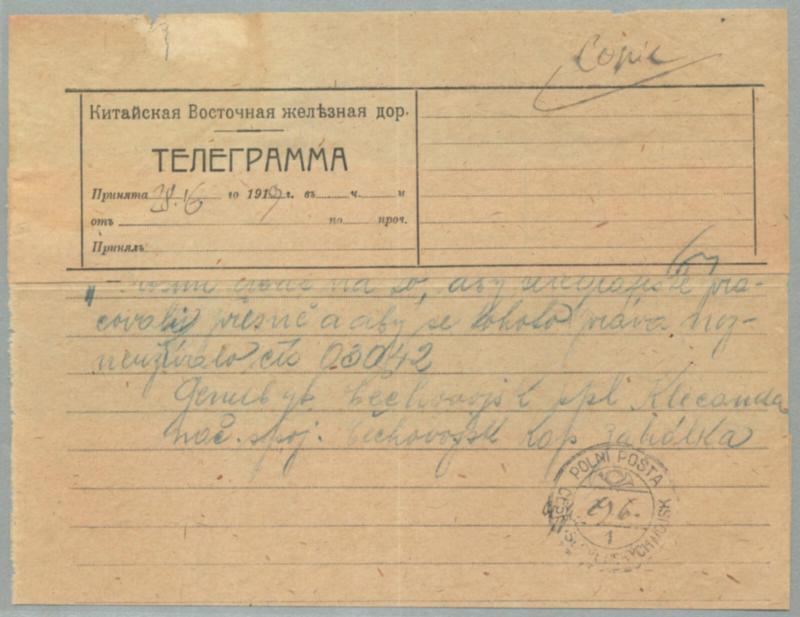 1919, original telegram form of the Chinese Eastern Railway (CER), used by the Czechoslovak Legion in Siberia, manuscript text in Czech written on pre-printed Russian form with date 7 VII 1919, endorsed Copie at top, authenticated by field post with circular POLNI POSTA CESKOSLOVENSKE VOJSKO 7 VII 1