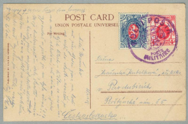 1919, souvenir postcard depicting Hongkong Harbour, acquired by Czechoslovak Legionnaire during return transit from Vladivostok to Trieste, sent to Czechoslovakia with mixed franking of Hong Kong 4c red King George V and a Czechoslovak Siberian Legion issue showing lion in medallion with vertical CE