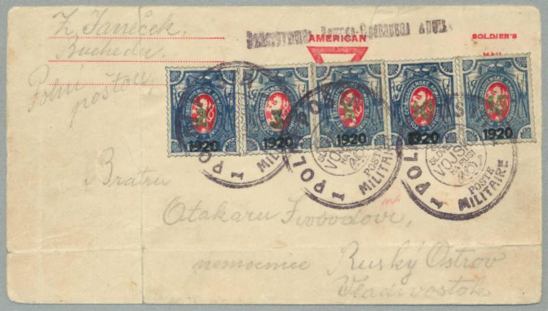 1920, from POLNI POSTA to Vladivostok, envelope franked with five examples of blue and red bi color label showing lion in medallion, each with black 1920 overprint, perforated, tied by multiple strikes of POSTE MILITAIRE VOJSKO NA RUSI circular handstamp, produced by Czechoslovak Legion as a fundrai