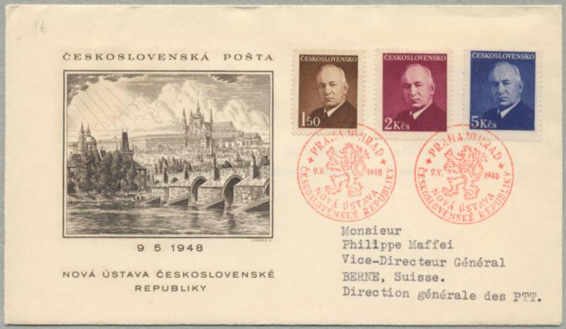 1948, 1,50 Kcs to 5 Kcs on commemorative cover for the new constitution of the Czech Republic on 9.5.1948 from PRAHA 10 HRAD to BERNE, tied by red commemorative cancel for the same event, interesting and attractive thematic item, XF! Estimate 100€.