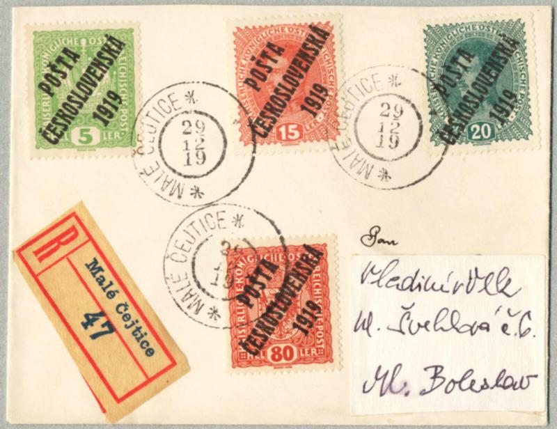 1919, 5+15+20+80 H on registered letter from MALE CEJTICE to BOLESLAV, good to excellent condition, VF-XF! Estimate 300€.