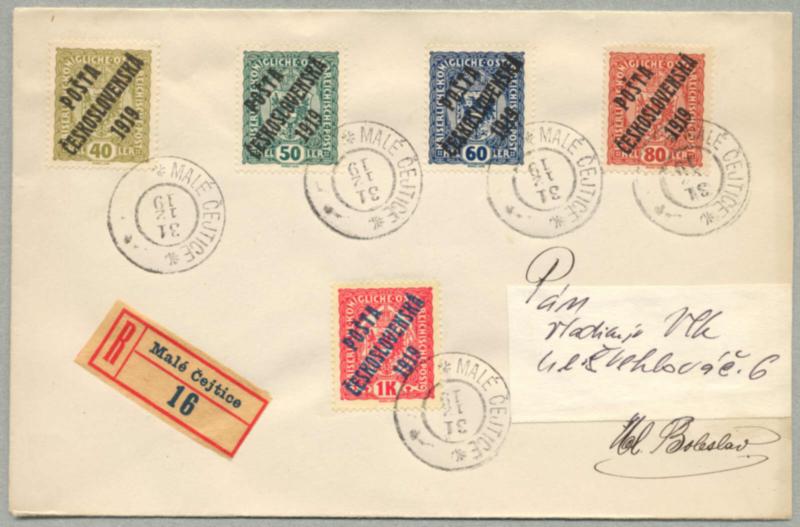 1919, 40+50+60+80+1K on registered letter from MALE CEJTICE to BOLESLAV, good to excellent condition, VF-XF! Estimate 300€.