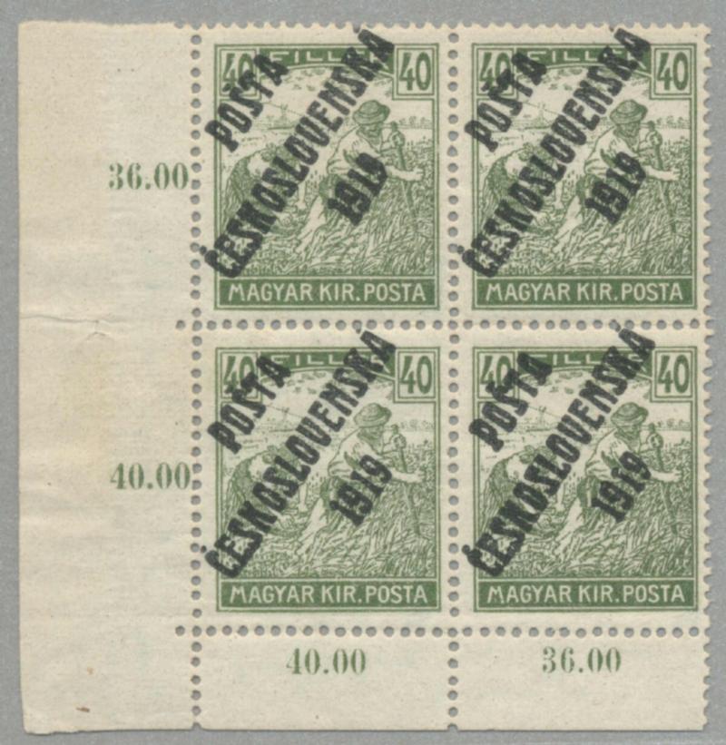 1919, 40f, block of (4) with lower left side margins, Hungarian stamp with Czech black opt, LPOG/LPOG never hinged, very fresh and desirable, VF-XF! Estimate 300€.