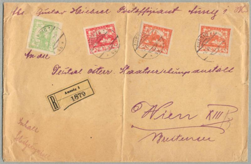 1919, 5, 10 and twice 40, on heavy weight registred cover from AUSSIG to Vienna, interesting and rare cover, XF! Estimate 400€.