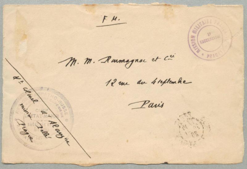 Stampless ONLY FRONT cover to PARIS, handstamped with rare double circle blue MISSION MILITAIRE FRANCAISE /LE VAGUEMESTRE/PRAGUE, lower left corner with large double circle blue REGION CARPATHO RUSSE CHEF D ETAT MAJOR handstamp, unclear PARIS arrival cancellation, carried during the post-war militar