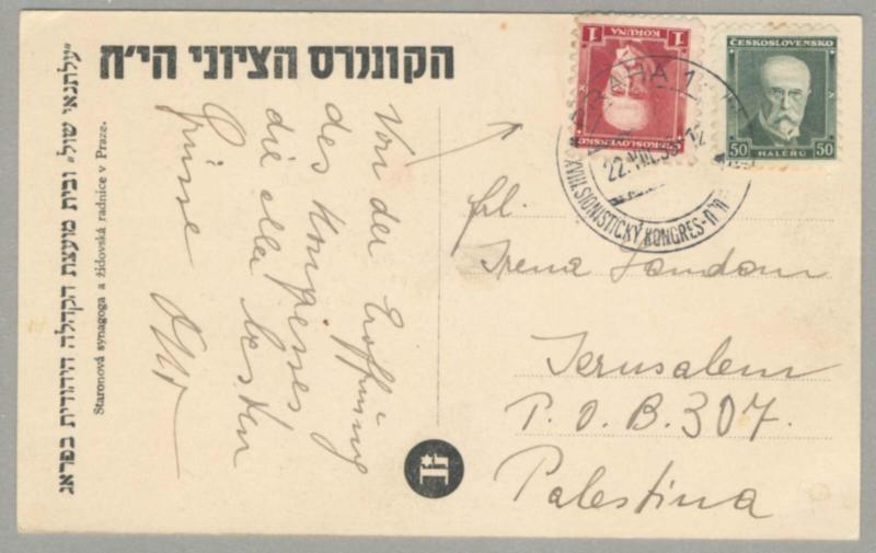 1933, from PRAGUE to JERUSALEM, franked with 1Kc red Masaryk and 50h green Masaryk definitives, tied by PRAHA 1 XVIII SIONISTICKY KONGRES cds dated 22.VIII.33, postcard showing Staronova synagogue and Jewish town hall in Prague, Hebrew and Czech bilingual text on front, sent to Jerusalem, Palestine,