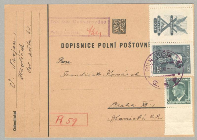 1938, uprated postal field service card to PRAGUE, used 2Kcs with tab and 50h with margin, stamps tied by POLNI POSTA 53 C.S.P. 17. X. 38 cds, boxed POLNI POSTA CENSUROVANO handstamp, red pencil censor signature, red boxed registration marking R 59, official Czech field post stationery printed DOPIS
