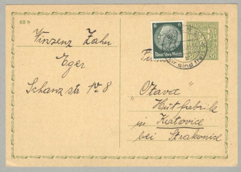 1938, from Eger, Czechoslovakia to KATOVICE, uprated Czechoslovak 50h green postal stationery card with added German 6pf green Deutsches Reich stamp, tied by EGER 2 WIR SIND FREI slogan cancel dated 10 10 38, German propaganda marking issued immediately following annexation of the Sudetenland, mixed