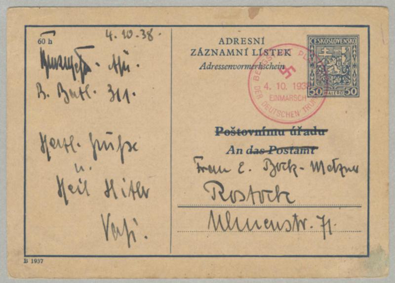 1938, from BERGSTADT to ROSTOCK, 50h blue Czechoslovak postal form card (Adresní Záznamní Lístek) with red circular cachet BERGSTADT PLATTEN EINMARSCH DER DEUTSCHEN TRUPPEN 4.10.1938 bearing swastika, used from Bergstadt by a platoon (Zug) of the German troops on the day of occupation of the Sudeten