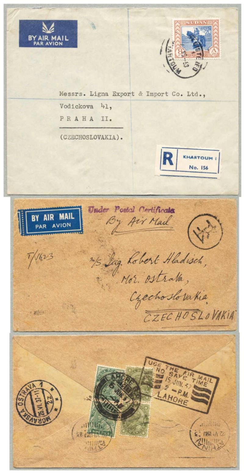 1937, 53, (2) Airmail/registered letters from Khartoum/SUDAN and Lahore/INDIA to CZECHOSLOWAKIA, good to excellent condition, VF-XF! Estimate 300€.