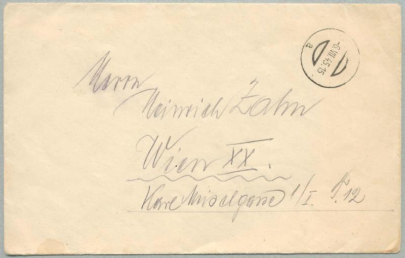1945, from CESKA LIPA to VIENNA, unfranked cover carried during the immediate postwar period, dispatch cancel with no town name dated 6.VII.45.15, large circular violet handstamp of RAZOUSKE REPATRIACNI KOMITE OKRES CESKA LIPA BEZIRK CESKA LIPA on reverse acting as official authorization for postage