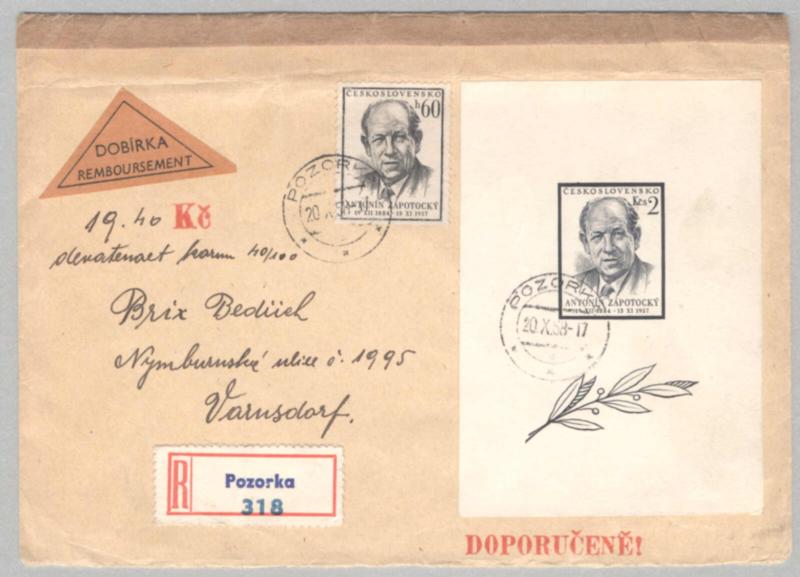 1958, From Pozorka to Varnsdorf, franking includes 2 Kcs block (imperforated) and 60h Antonín Zapotocky memorial stamp, cancelled POZORKA 20.X.58, registered label POZORKA 318, orange triangular DOBIRKA REMBOURSEMENT cash-on-delivery label, handwritten remittance amount 19.40 Kcs, printed DOPORUCENE