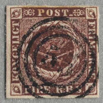 1851, 4 S, FIRE R.B.S., brown, imperf, cancelled 3-ring 55 - RIBE, good to ok margins, fresh, VF-XF! Estimate 100€.