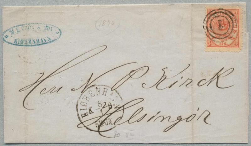 1870, 4 skill, pale red, on letter from COPENHAGEN to HELSINGOR, cancelled with 3ring cancel 1 of COPENHAGEN, aside cancel KOIBENHAVN, reverse with transitional N. SJ. JB. PB, 3ring 229 and arrival HELSINGOR, interesting and desirable, VF! Estimate 120€.
