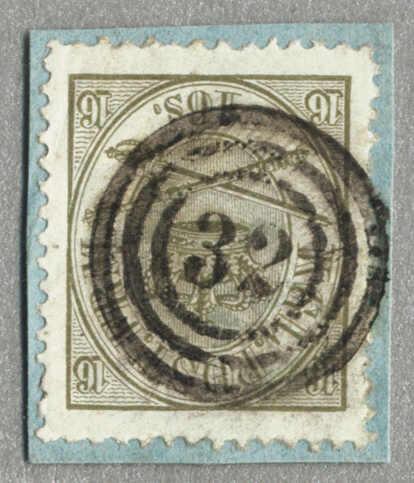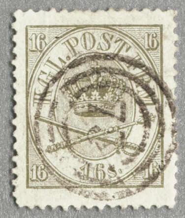 1864, 16s., olive-grey, perf 13 x 12 1/2, used, wmk Crown II, on piece, with black triple circular cancel 32 (Kallundborg), magnificently fresh and desirable, XF-SUP! Estimate 400€.