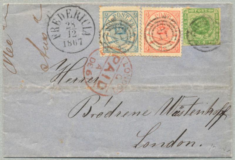 1867, from Fredericia to London, cover franked with 4 skilling blue imperforate (Facit 5), 8 skilling green perforated 13×12½ (Facit 11), and 16 skilling orange perforated 13×12½ (Facit 13), all cancelled by three-ring mute numeral 17 (Fredericia), adjacent departure circular FREDERICIA 28/12 1867,