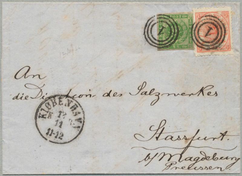 1866, 8+4 skill, (2), on letter from KOPENHAGEN to STRASSFURT, cancelled ringed 1 of Kopenhagen, interesting mixed franking from two issues - one perf the other imperf, reverse blue LÜBECK, ex Provera, very fresh and attractive, XF! Estimate 400€.