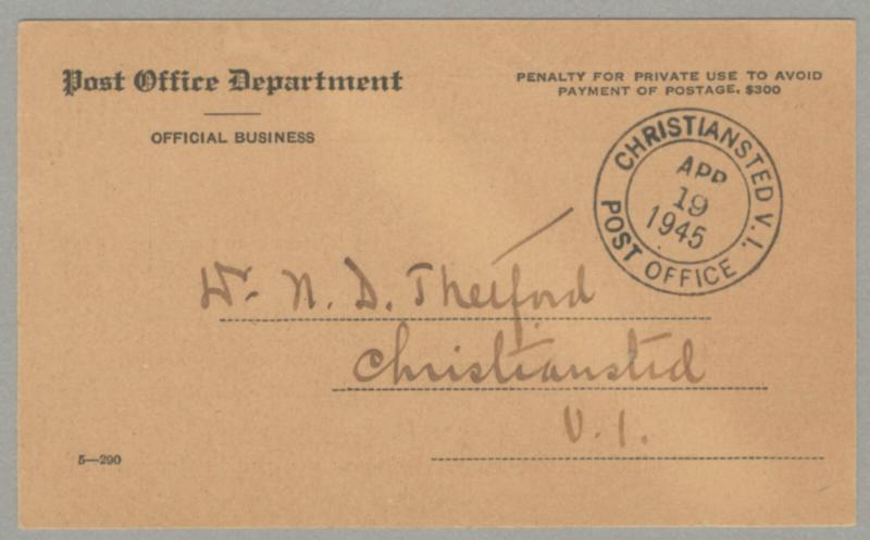 1945, from Christiansted Virgin Islands to local recipient, official postal business card Form 1585 Request to Call, dated APR 19 1945, used by United States Post Office to summon claimant in connection with a damaged or lost registered item, handwritten annotation refers to registered article numbe