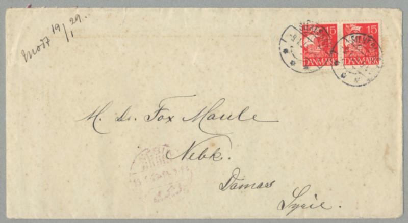 1929, from Silkeborg to Nebek near Damascus, Syria, commercial envelope franked with pair of 15 ore red King Christian X issues tied by SILKEBORG CDS, addressed to M. de Fox Maule with transit and partially illegible arrival backstamp DAMAS 18.1.29, manuscript calculations on reverse, private corres