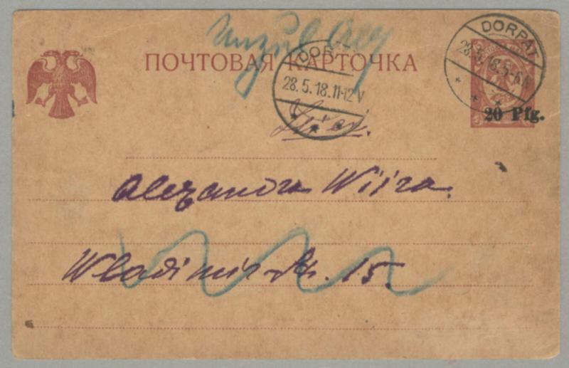 1918, from Dorpat (now Tartu, Estonia), uprated Russian postal stationery card with red imperial double-headed eagle and inscription ПОЧТОВАЯ КАРТОЧКА (POSTCARD in Russian), bearing local black surcharge 20 Pf., cancelled DORPAT 28.5.18 with additional manuscript marking, German-language message req