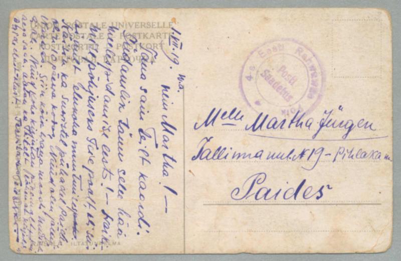 1919, color picture postcard to Paides showing a rural Estonian riverside village, sent unfranked by member of Estonian forces during the War of Independence, full strike of violet circular military cachet reading 4 S EESTI RAHWA POSTI SAADETUS 11 7 19 with partially unclear wording, long message in