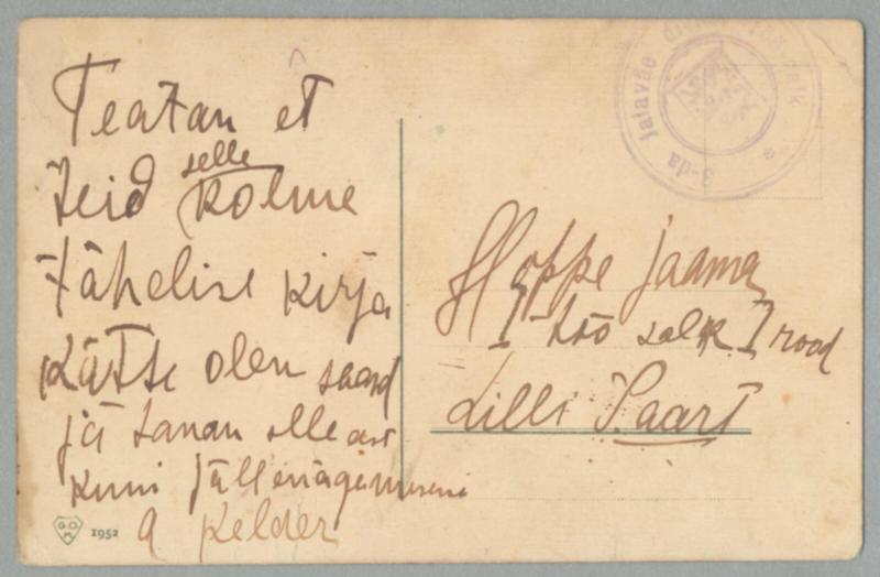 1952, picture postcard with cottage and swans scene, printed by GOM in 1952, written in Estonian, bearing violet circular handstamp of 3-DA JALAVÄE (3rd Infantry), likely applied by or in reference to a former military unit, no postal markings or postage, possibly privately delivered or retained as