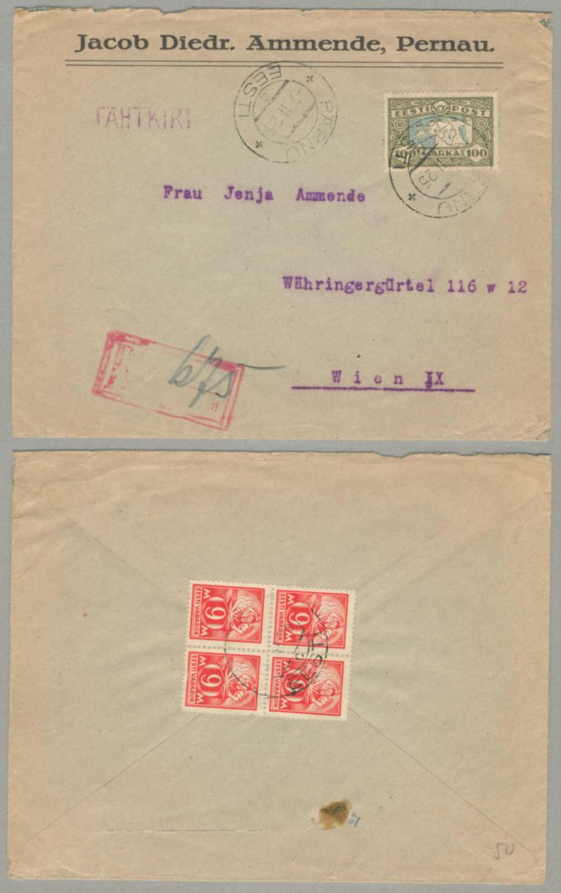 1925, from Pärnu to Vienna Austria, commercial cover from Jacob Diedr. Ammende, franked with single 100 marka green on front and block of four 9 marka red EESTI VABARIIK issues on reverse, tied by clear PÄRNU EESTI 7 11 25 circular datestamps, violet straight-line TÄHTKIRI registration marking, red
