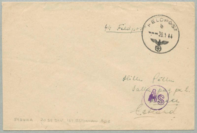 1944, from FELDPOST to LAKKE, Estonia, postage-free soldier’s letter, FELDPOST 28.1.44 cancel with eagle and swastika, purple censor handstamp AS, manuscript notation 20 SS DIV 1st Estonian BDE, World War II Eastern Front usage from Estonian Waffen-SS unit, linked to the 20. Waffen-Grenadier-Divisio