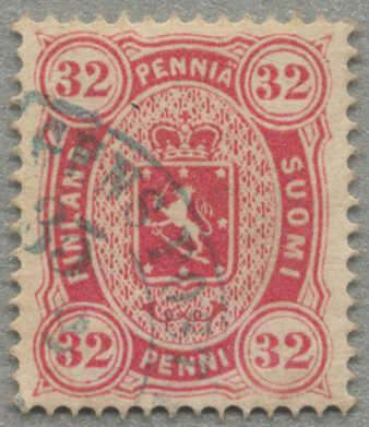 1875, 32 Penni, carmine, comb perf 14:13 1/2, no wmk, cancelled with blue railway-postwagon cancel (FINSKA JERNVA) GENS POST (KUPE EXPED:) 35 (No.) 3, cert. Witschi, beautiful example of this scarce stamp, fresh and desirable, XF! Estimate 700€.