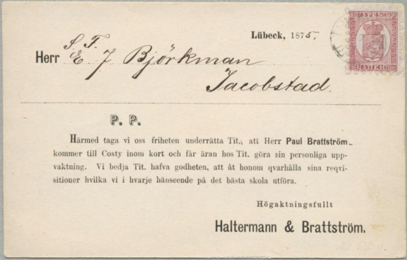 1875, 5 pen, reddish lilac brown, pale lilac blue paper, on printed matter from Lübeck to Jacobstad, faint blue-greenish cancel, all teeth present, ex Provera, very fresh and attractive, XF! Estimate 800€.