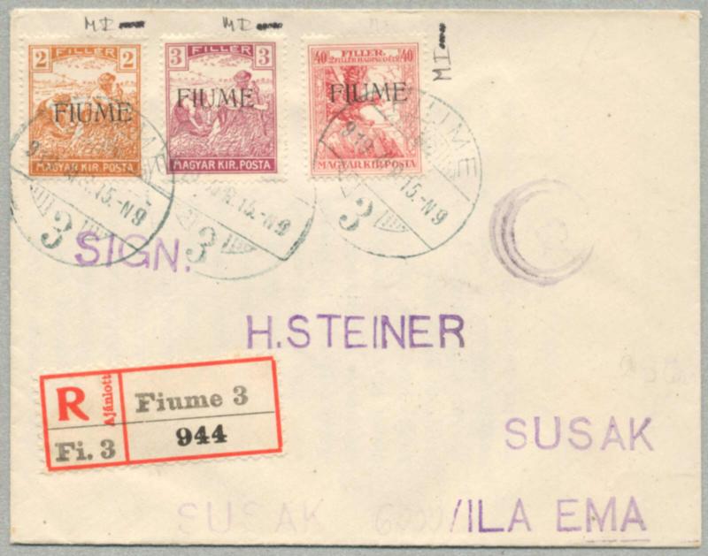 1919, 10+2+15+2+40+2f, (3), black FIUME opt, on registered cover from FIUME to SUSAK, cancelled FIUME 19. APR 15, R label Fiume 3, reverse with arrival SUSAK, fresh and desirable letter, XF! Estimate 800€.