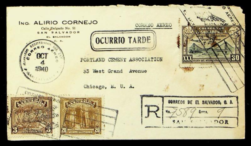 El Salvador 1940 3v Regd airmail cover from San Salvador to Chicago Illinois USA