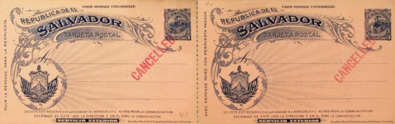 SEPHIL SALVADOR 3c + 3c MINT UNUSED PS REPLY POST CARD PAIR WITH CANCELLED OVPT.