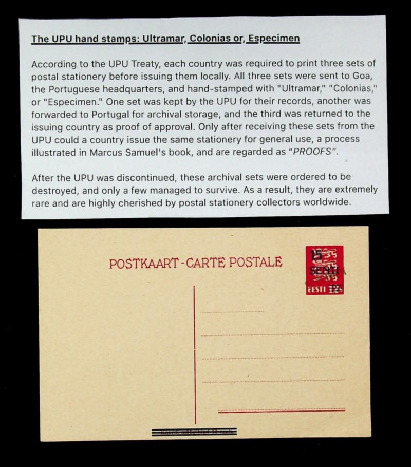 Estonia 15s s/c on 12s unused postcard Proof h/s “SPECIMEN” by UPU Portuguese Receiving authorities at Goa India