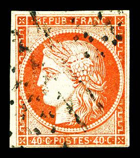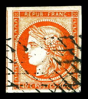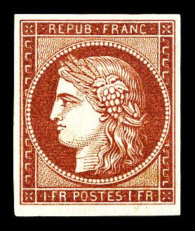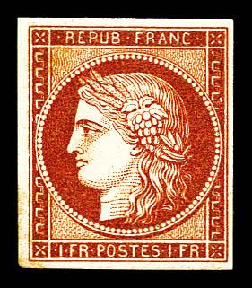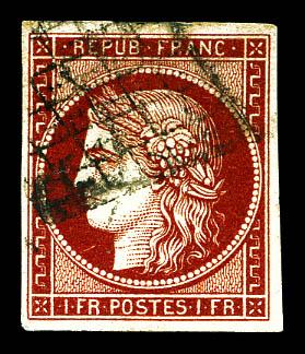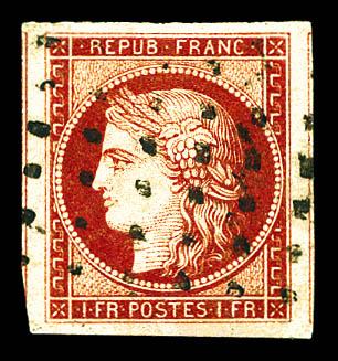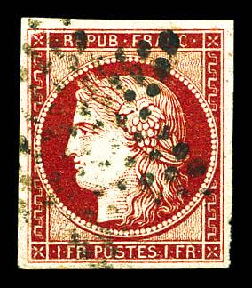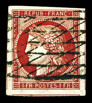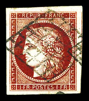 N°6b, 1fr carmin foncé, quatre belles marges équilibrées, grande fraîcheur. SUPERBE. R.R. (signé Bernichon/certificats) Qualité: * Cote: 18500 euros