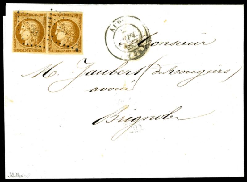 N°1a, 10c bistre brun-foncé en paire sur lettre de Aups le 2 septembre 1852 pour Brignoles. SUP (signé Scheller/certificat) Qualité: Oblitéré Cote: 2000 euros