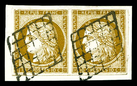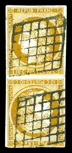 N°1d, 10c bistre jaune en paire tête-bêche obl grille, PIECE SUPERBE. R.R. (signé Calves/certificats) Qualité: Oblitéré Cote: 25000 euros