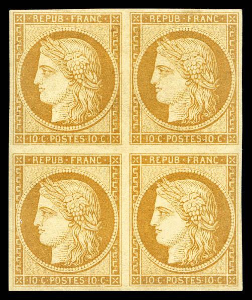 N°1, 10c bistre en bloc de quatre, frais. TTB. R.R. (signé Calves/certificat) Qualité: * Cote: 15000 euros