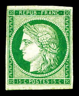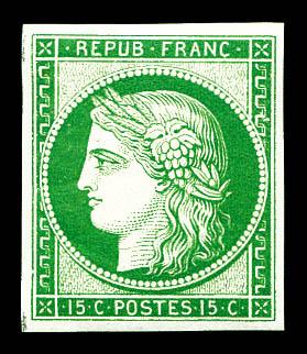 N°2, 15c vert, nuance soutenue, filet inférieur touché, TB d'aspect. R.R. (signé Calves/certificats) Qualité: * Cote: 28000 euros