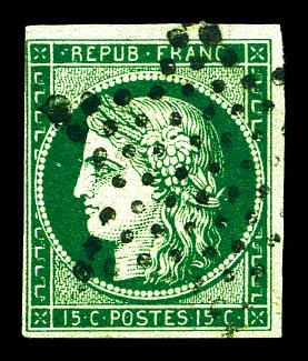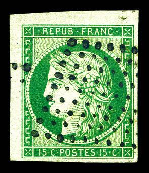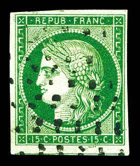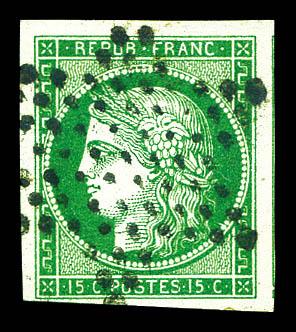 N°2c, 15c vert très foncé obl étoile, jolie nuance intense. SUP (signé Scheller/Certificat) Qualité: Oblitéré Cote: 2800 euros