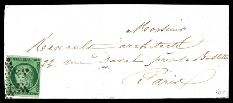 N°2, 15c vert obl grille sur lettre locale de Paris, TTB (signé Calves/certificat) Qualité: Oblitéré Cote: 1850 euros