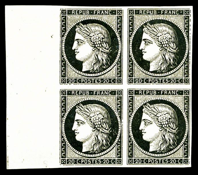 N°3, 20c noir sur jaune en bloc de quatre (1ex*), grand bord de feuille latéral, SUPERBE (certificat) Qualité: **
