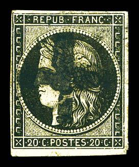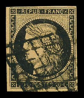 N°3g, 20c noir sur fauve, très jolie couleur. SUP (certificat) Qualité: Oblitéré Cote: 800 euros