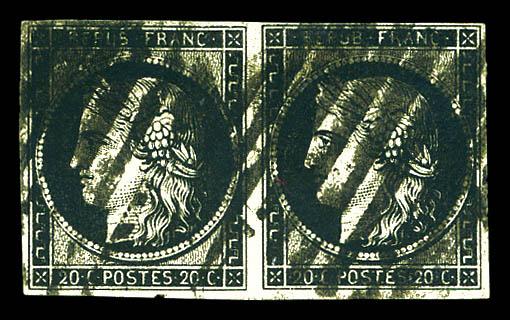 N°3, 20c noir en paire oblitération barres de Lille en cercle. SUP. R. (signé Calves/certificat) Qualité: Oblitéré Cote: 3500 euros